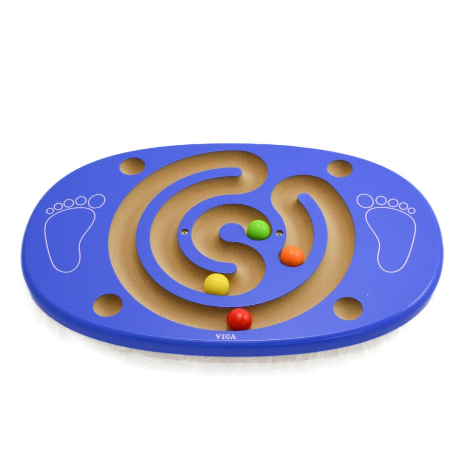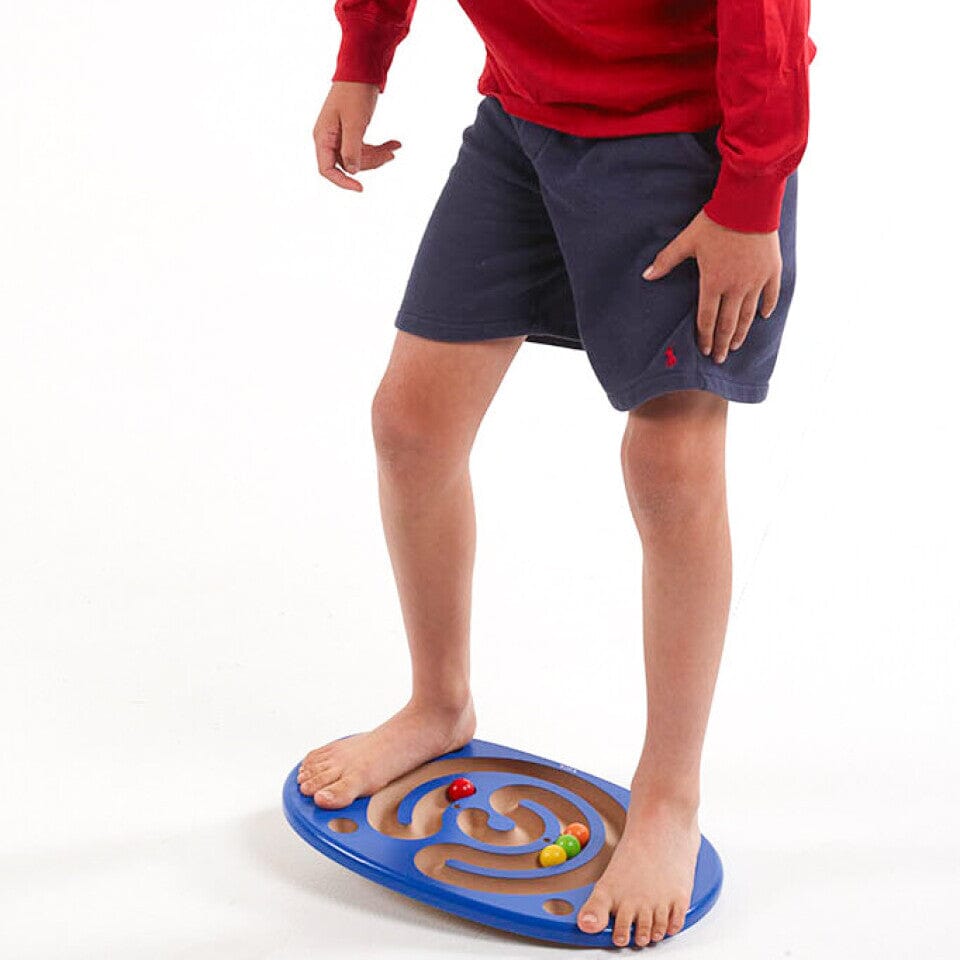 3 colourful wooden balls of the Balancing Board Maze can be rolled through the labyrinth using feet, legs, or hands and arms, building up balance and patience.