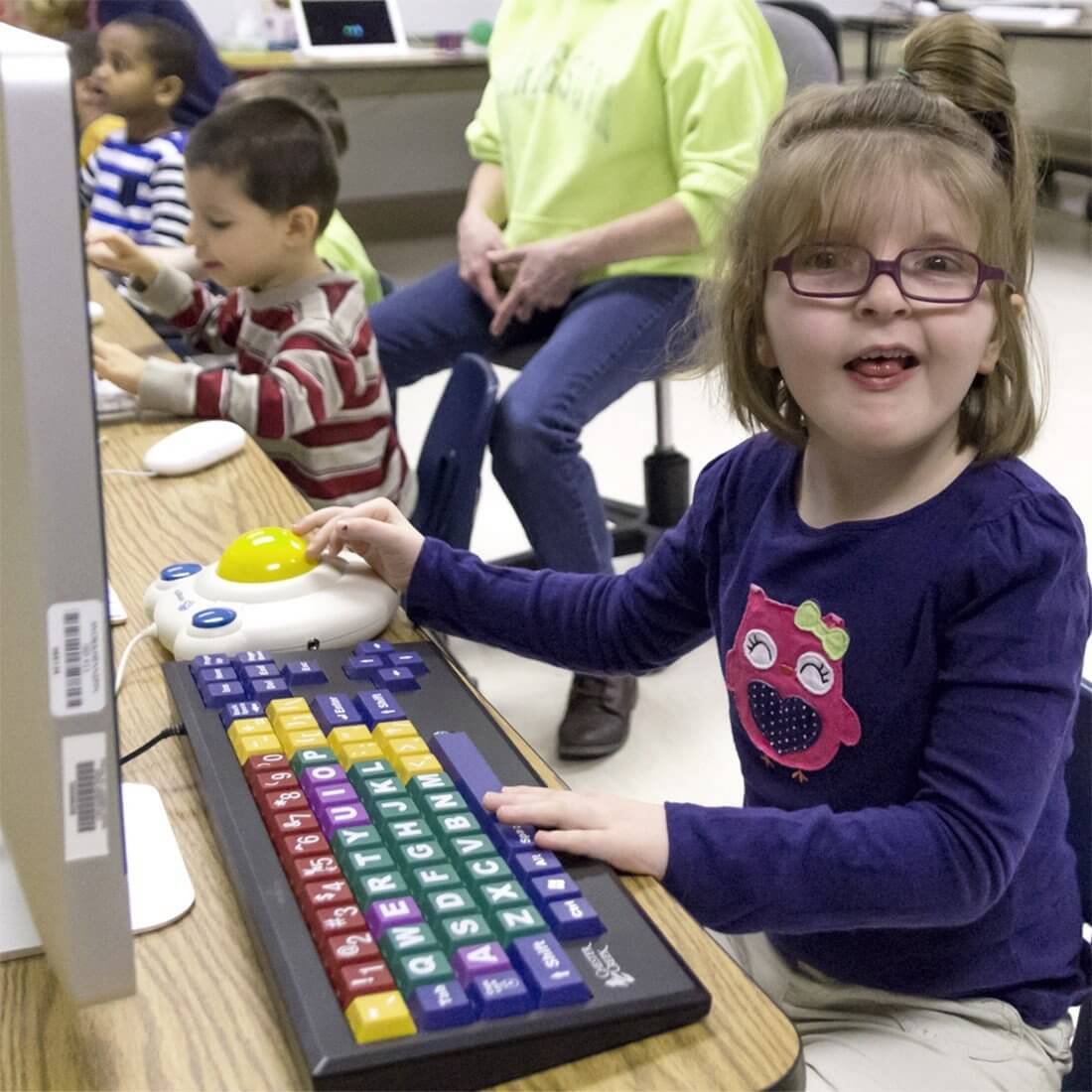 BIGtrack has a 3-in/7.6-cm trackball, which makes it the largest trackball mouse available. The large trackball requires less fine motor control than a standard trackball and it is ruggedly built. BIGtrack has a left and a right mouse click button located behind the trackball to avoid unwanted mouse clicks, and switches can be plugged into the two switch jacks to activate the left and right click function. BIGtrack also allows for second mouse connection; both BIGtrack and a second mouse can be connected allowing simultaneous participation.