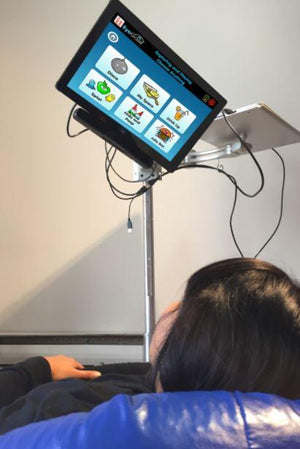 The EyeLearn tilts up, down, sideways or back, for almost any head position. This easy repositioning is critical for a classroom where there is a wide variety of needs. The arm can accommodate not only a range of mobility from a walk-up user standing, to a prone user in in a reclined chair, but also a variety of head positions. The screen itself can tilt, twist and pitch in virtually all directions so that the camera can be targeted to the student's eyes, rather than the student to the camera, for maximum comfort.