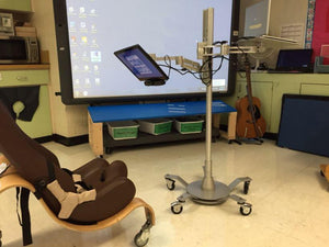 This flexible arm for mounting the monitor with the eye gaze camera offers an extremely wide range of positioning options without having to loosen or lock anything. With just fingertip control, the arm dips down low enough for a student in a wheelchair or a bean bag chair, or swings high up for someone standing or using a walker.