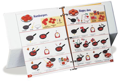 Look 'n Cook Cookbook features recipe illustrations that are clear, concise and easy to "read." Each picture step has accompanying text. A color-coding system makes it easy to follow measurement and temperature requirements. Cookbook has laminated pages and a wipe-clean vinyl easel binder.