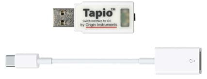 Tapio is a native USB switch interface that can be connected to an Apple iOS device using an Apple USB camera adapter.
