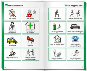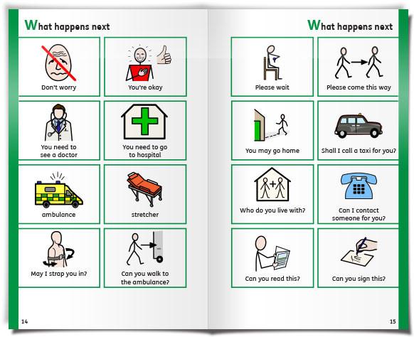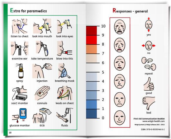 The layout of the book mirrors how medical situations normally progress from first contact through to diagnosis and initial treatment. In addition, the back of the booklet provides easy access to a pain scale and core responses that may be used at any time. For example, the responses 'Yes' and 'No'.